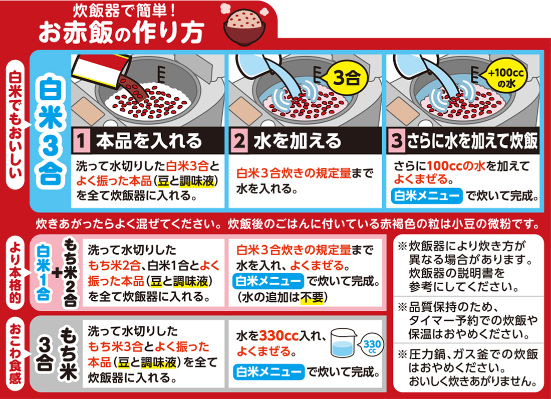| 白米ともち米を混ぜて使用 | 洗って水切りしたもち米1合、白米1合とよく振って調味液30㏄を捨てた本品を炊飯器に入れる。 白米2合炊きの規定量まで水を入れる。 |